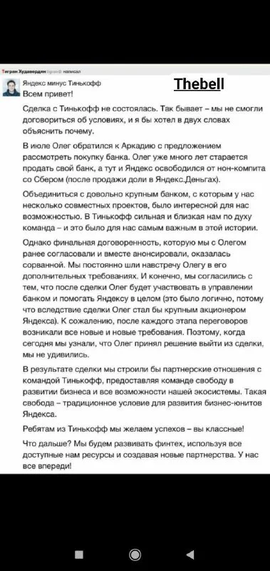 Тиньков прокомментировал срыв сделки с «Яндексом» по покупке банка https://russian.rt.com/business/n...
