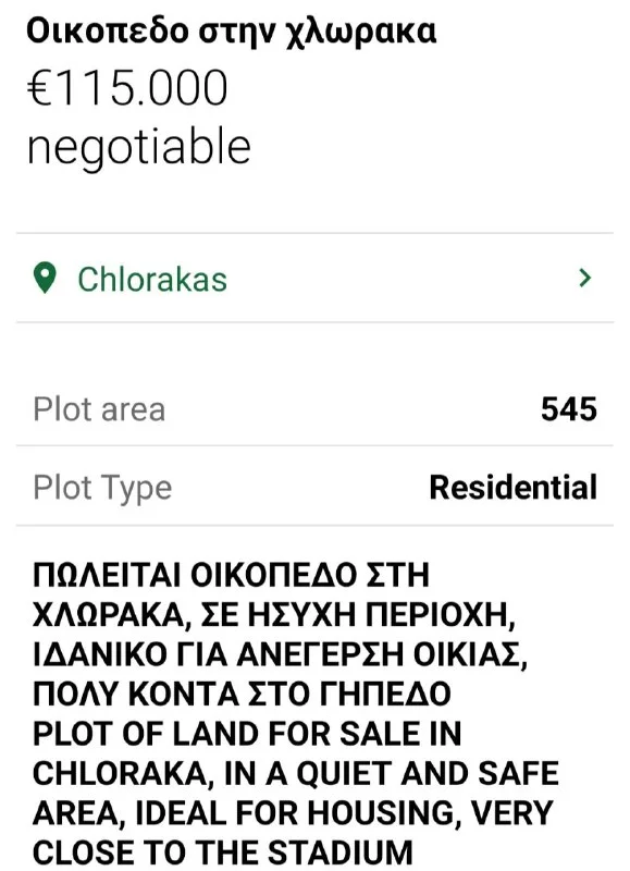 Этот "Ideal For Housing" прямо напротив въездных ворот кладбища. Там реально метров 5-10 всего. Про другие особенности Хлораки в плане "Quiet and Safe" думаю нет необходимости упоминать - про это даже в Лимассоле наслышаны :)