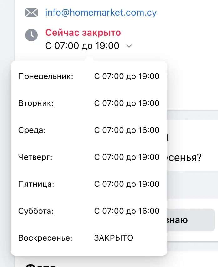 Кто нибудь знает часы и дни работы HomeMarket в Пафосе? На сайте нигде нет инфы, на удивление, на гугл мапе тоже