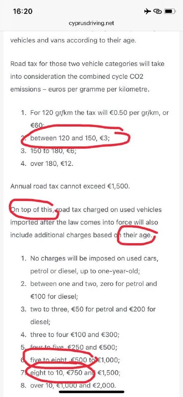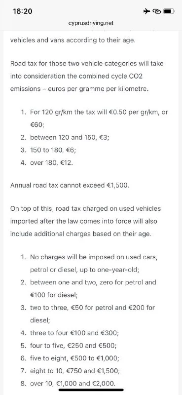 Подскажите, где можно почитать про road tax на Кипре? Имею информацию с сайта страховой, что с 2019 года он складывается из двух частей-emission+возраст и дизельная пятилетка в год улетает в космос (1000+ евро)