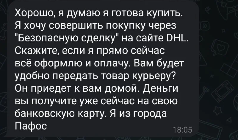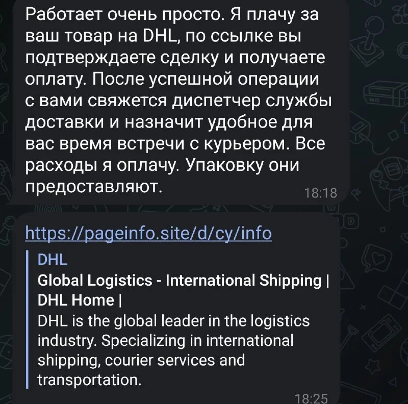 Вот я пытаюсь нагуглить "безопасная сделка DHL" и ничего не нахожу. Да и с самого начала разговор похож на шаблонный. Ради интереса узнаю что будет дальше )