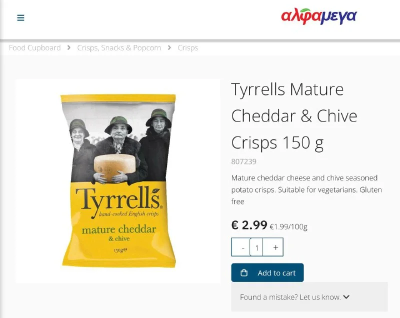 А прям точно нет ? А то навскидку в Альфамеге их хоть чем ешь. От Lays до Tyrells. Даже с фетой видел. Ассортимент в живых магазах ещё больше. https://www.alphamega.com.cy/en/groceries/food-cupboard/crisps-snacks-popcorn?pagesize=168