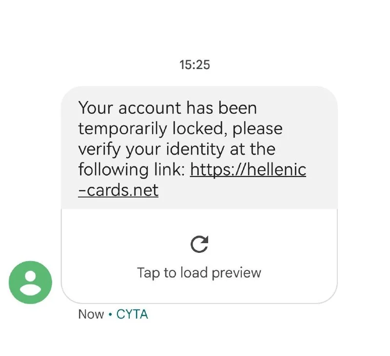 Осторожно, мошенники 😬 Высылают смс с ссылкой на левый сайт. У меня нет аккаунта в hellenic банке, поэтому сразу почуяла неладное. Муж тоже такое смс получил.