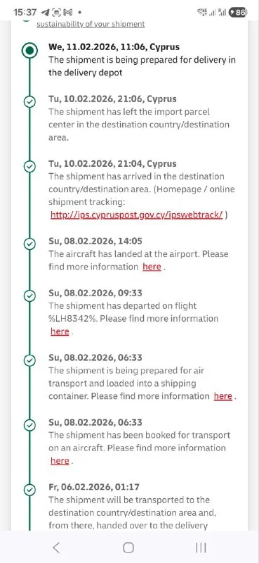 Я на e-bay купил вещь из Германии, тоже по треку в Франкфурте застряла посылка на 29 дней, потом появилась в Ларнаке и за пару дней дошел до Пафоса.
