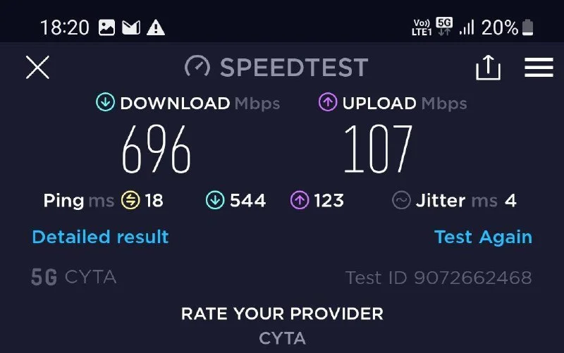 Ларнака, Cyta, перешёл на новый телефон с 5G, результаты замера скорости. На 4г там же было 60/20 в среднем. Я в шоке и доволен.