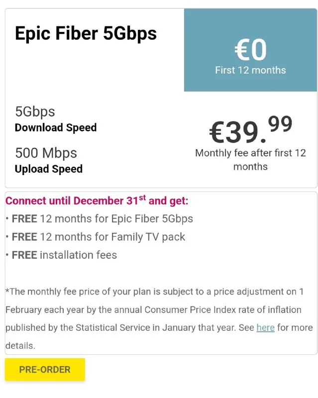 Никто в последнее время не проходил квест "как узнать сколько будет стоить epic fiber при продлении контракта?" Никосия, через месяц заканчивается двухлетний контракт. Пошел проверить на сайте, все попытки посмотреть текущие и будущие тарифы заканчиваются в https://www.epic.com.cy/en/page/EfoTinQQu/epic-fiber с большой кнопкой "check fiber availability", ввод любого зип кода там дает ошибку. Внизу страницы закладка Charges и вроде бы искомая надпись "Available plans are subject to geographical coverage. To check plans available in your area, click here." но по ссылке here попадаю опять на ту же страницу в неработающую кнопку check availability. В офис надо идти?