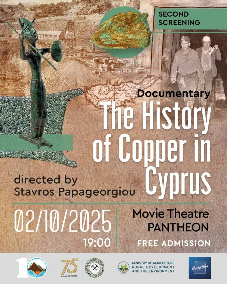 После огромного успеха премьеры, которая в мае этого года собрала более 700 зрителей в муниципальном театре Никосии, документальный фильм «История меди на Кипре» покажут снова. Второй показ состоится 2 октября в кинотеатре Pantheon Cinema (с английскими субтитрами).