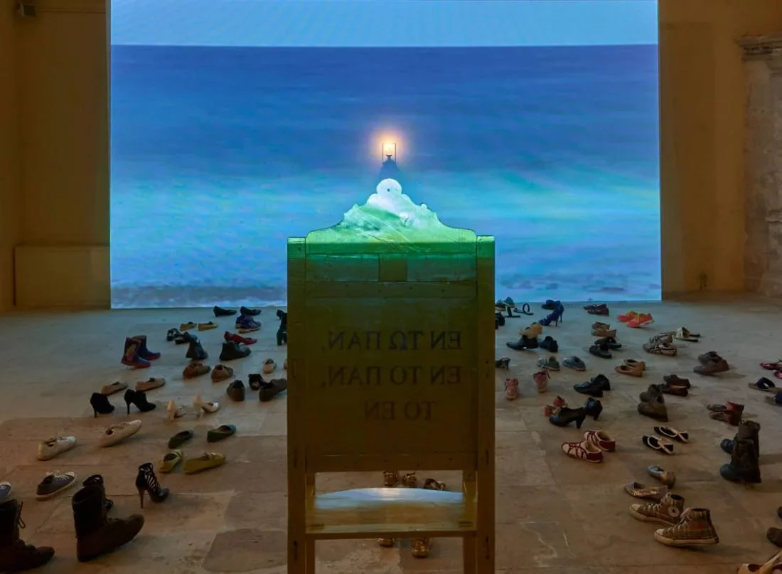 На полу галереи и за ее пределами лежат сотни пар использованных туфель, расположенных так, как будто они идут. Эти туфли прошли по улицам, площадям и кварталам Ларнаки. Они были подарены жителями города и принадлежат людям разного возраста, пола и этнической принадлежности.