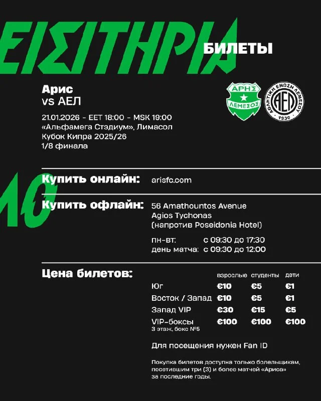 Принимаем дома АЕЛ. Билеты в продаже уже на сайте и в Aris FC Shop с понедельника 💚