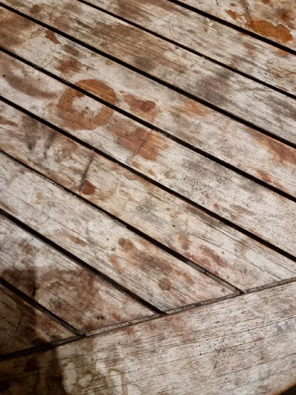 Пятна шкурить наждачной бумагой, но если там когда то лежал кусок жирного мяса денёк-то пропиталось глубоко.