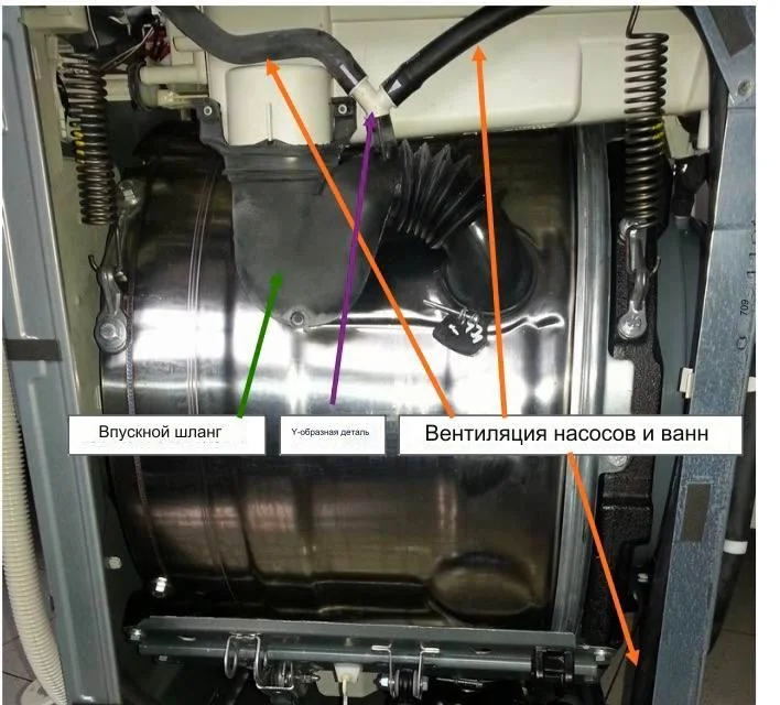А вода с порошком - через толстое чёрное колено в толстую гофру и затем в бак.