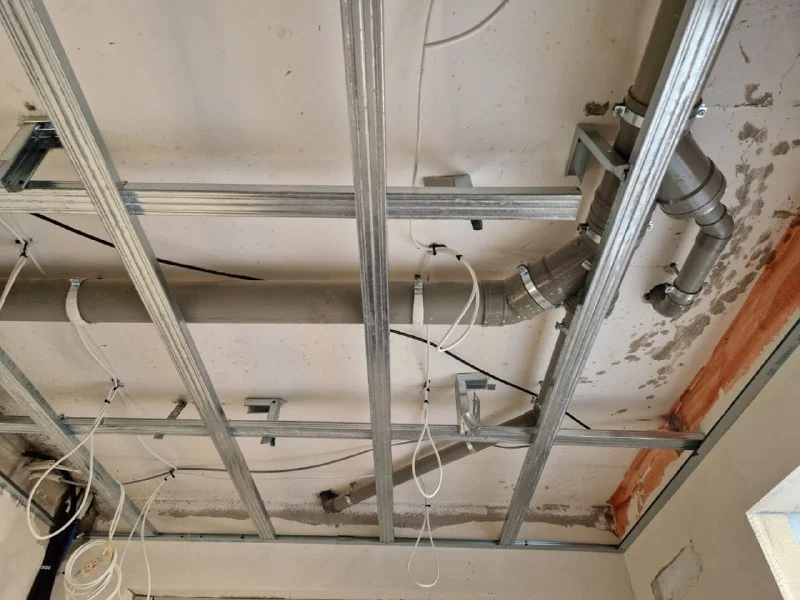 Тут подсказали что для каркасников с перекрытием по профнастилу тут только так и делают. В-общем понятно почему. Что касается высоты потолков, то если делают разводку по потолку, просто не делается толстая стяжка. Те же 20 сантиметров. Хотя вот тут безобразно профиля смонтированы. Лазерный нивелир пока незнаком.