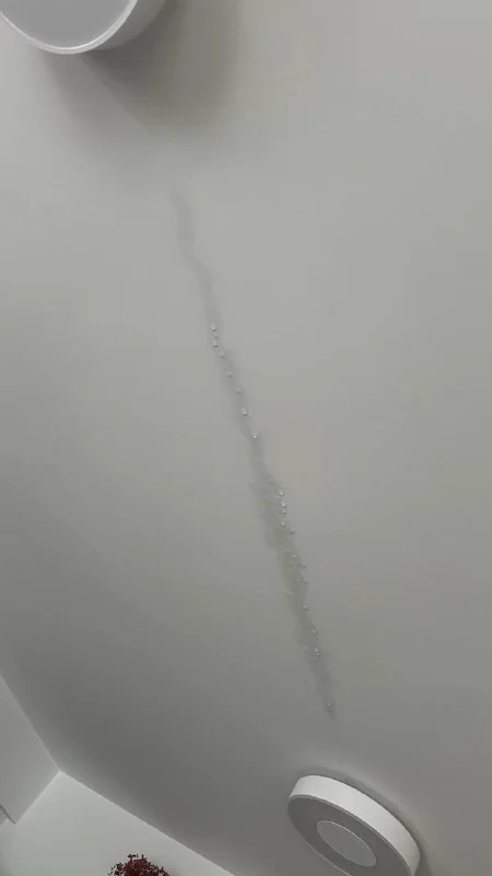 Уважаемый коллективный разум, помогите советом :) Последний этаж трехэтажки? возраст дома 6 лет. Сегодня утром появилась такая вот шняга прям посреди комнаты, на полу тоже была вода - думаю в сумме 200-300 мл. Не думаю что крыша делалась из плит, значит это не "просочилось", да и на крыше над этим местом даже луж нет. Судя по прямой линии между лампами, это наверняка как-то связано с трубами, проходящими "под" основной плитой, но у меня все равно нет идей....