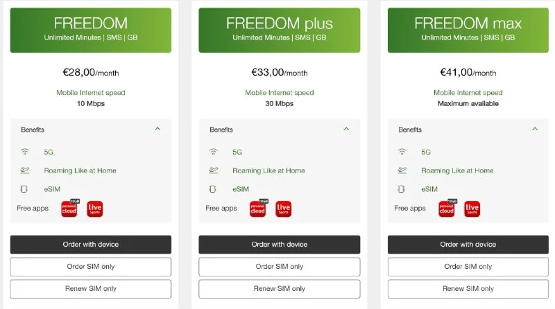 Cyta тариф Freedom (безлимит по трафику/звонкам/SMS) - от 28 юро в месяц (за 10 Мбит) до 41 юро в месц за скорости до 800 Мбит