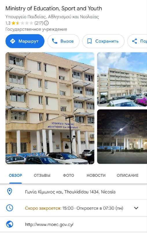 Подскажите пожалуйста адрес Министерства Образования в Никосии?