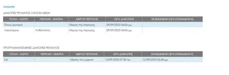 С 16:06 во вторник без света остаются районы Лакатамия (Антуполи) и Пано Дефтера. Время восстановления электроснабжения пока неизвестно, сообщили в EAC. Дополнительно объявлено плановое отключение в деревне Сиа 12 сентября с 07:30 до 14:30.
