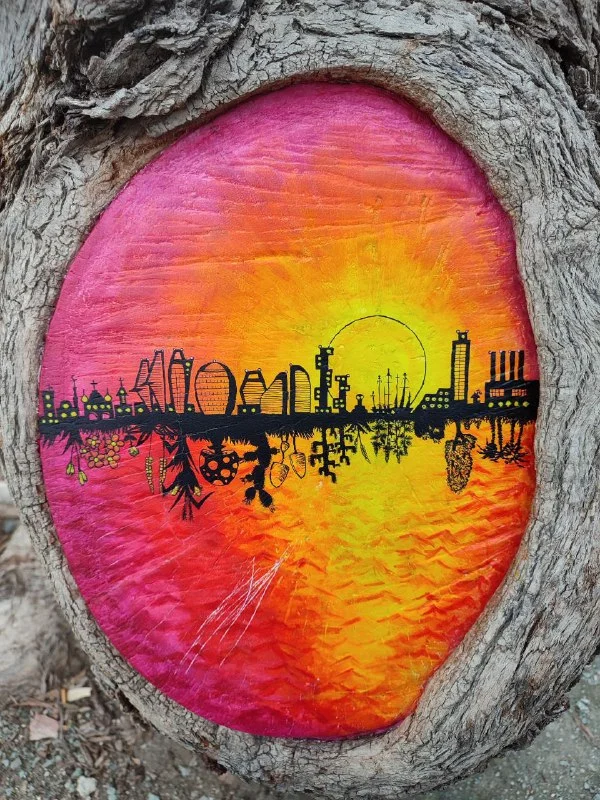 Коллекционирую фотографии вот таких вот росписей на деревьях. Конкретно эта картинка очень порадовала, но в правой части примерно от солнышка, где что-то похожее на антенны, не могу опознать, поэтому и спросила про место, откуда снято фото с трубами