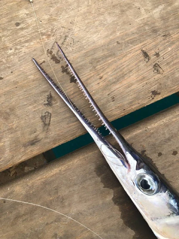 На пальму показывает :) видимо там сокровище зарыто