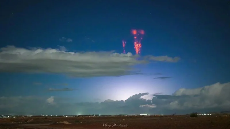 Над Кипром вновь зафиксировали редкое атмосферное явление — красные спрайты, электрические вспышки, возникающие высоко над грозовыми облаками.