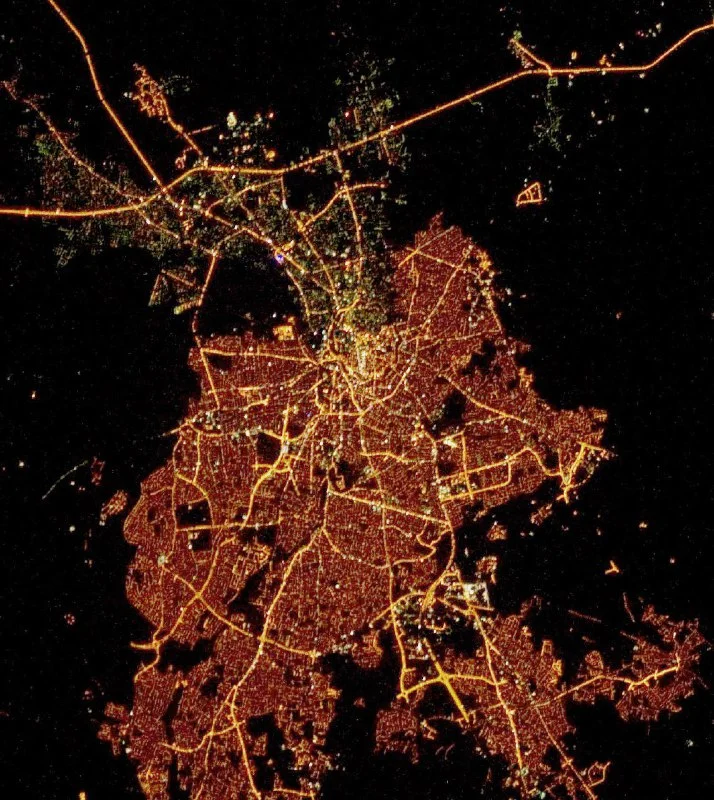 Night lights of Nicosia, seen on r/MapPorn. You can distinguish between the orange part (Greek) and the green one (Turkish)