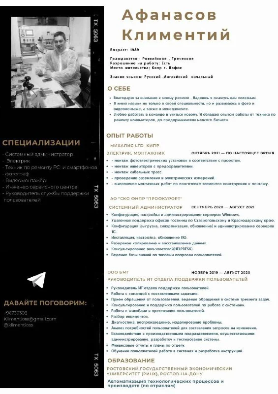 Всем привет , ищу любую работу г.Пафос разрешение на работу есть гражданство ЕС . Ключевые навыки техник по ремонту пк и смартфонов , системный администратор , монтажник электрик , видиомонтажер , фотограф . Возможно окажусь кому то полезным .