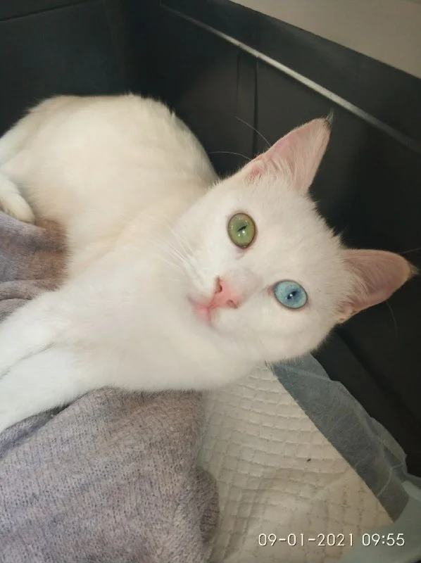 Ищем добрые руки и уютный дом для кота породы Кхао Мани , абсолютно белый с редкого встречающимся голубым глазом. Коту примерно 8 месяцев. Котик ласковый, игривый, спокойный в меру, но как водится красота требует жертв и котейка абсолютно глух на оба уха . Эта особенность делает его содержание несколько нестандартным.. Он не играет с тем чего не видит, пугается прикосновений изза спины или когда спит, громким голосом выражает свои желания . Но не боится пылесоса, хлопающих дверей, шуршаших пакетов и шумных детей. Желательно чтоб кот не имел свободного и бесконтрольного выхода на улицу или на балкон тк он не услышит машину или собаку...