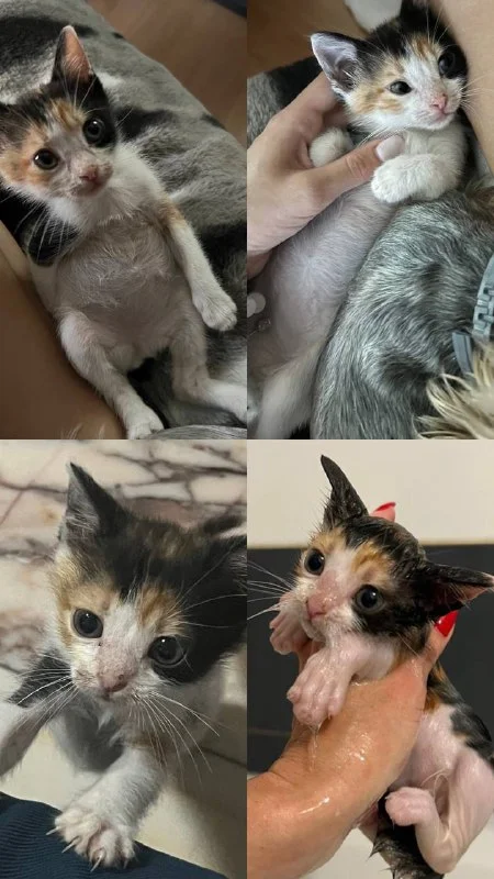 Думаю, это девочка ( трехцветная), возраст около месяца. У себя оставить совсем не можем.