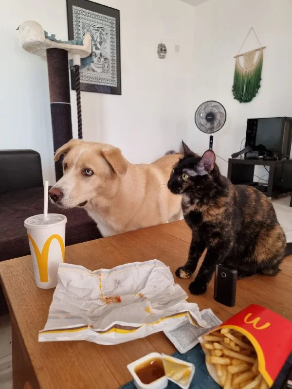 Да)) у меня ощущение он хозяин, а я в роли обслуживающего персонала. При этом он к соседу киприоту обедать ходит. Тот начинает мне перечислять его меню. А там, девочки, блэк Ангус стейки, свежая печень, рыба. Жизнь удалась))) только вот сейчас жалко очень его. Кстати, я тут со своими паштетами все утро бегала, плакала, а сосед сейчас тунца принёс и он поел