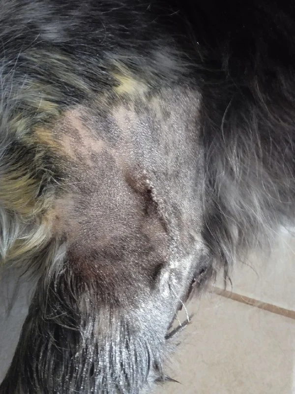 Чёрное пятно- это там,где она начала лизать недели 1.5 назад, разлизала и мы надели воротник