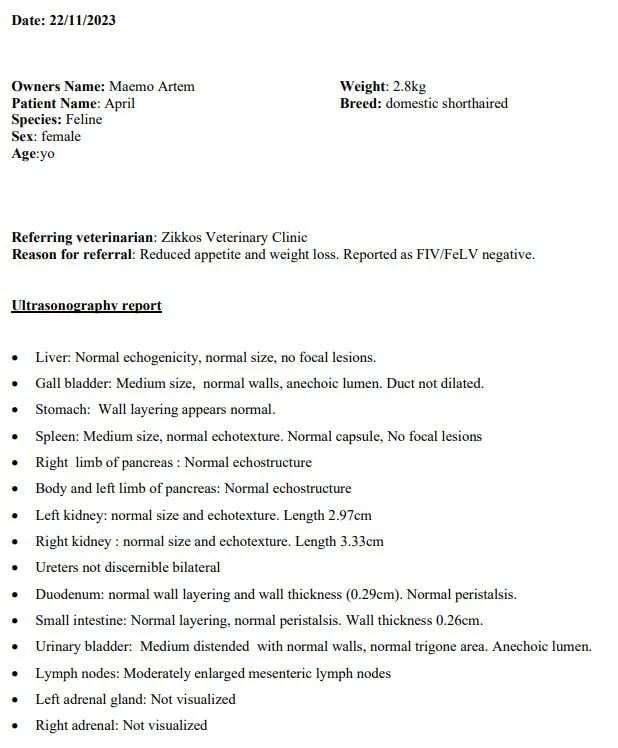 Диагностика: FIV/FeLV отрицательно. Первые анализы показали отклонения по печени, пролечились 3 недели клиндамицином и урсофальком, фебтал 5 дней. На прошлой неделе пересдали кровь, УЗИ. Каких-то явных проблем больше нет, увеличены лимфоузлы, а аппетит так и не появился. Последние дни она полностью отказалась от еды. Из странного: у кошки неустойчивые задние ноги, прыгает хорошо. Я не могу вспомнить, всегда ли она так ходила или это в последнее время появилось, впервые я это заметила месяца 3 назад. За месяц ухудшений по ногам нет.