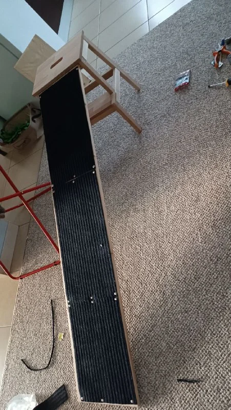 На доску прибили коврики, саму доску на уголки прикрепили к лесенке, и получился даже не прям колхозный пандус.