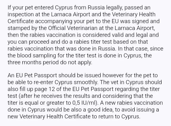 Однако, чтобы не возникло проблем при возвращении на Кипр, питомец должен получить европаспорт. Ветеринар на Кипре должен заполнить страницу 12 в европаспорте, вписав туда результаты теста на титры антител к бешенству после их получения (уровень антител должен быть равен или превышать 0,5 IU/ml). Также имеет смысл сделать ревакцинацию от бешенства на Кипре, чтобы не пришлось получать евросертификат для возвращения питомца на Кипр из-за пределов Евросоюза.