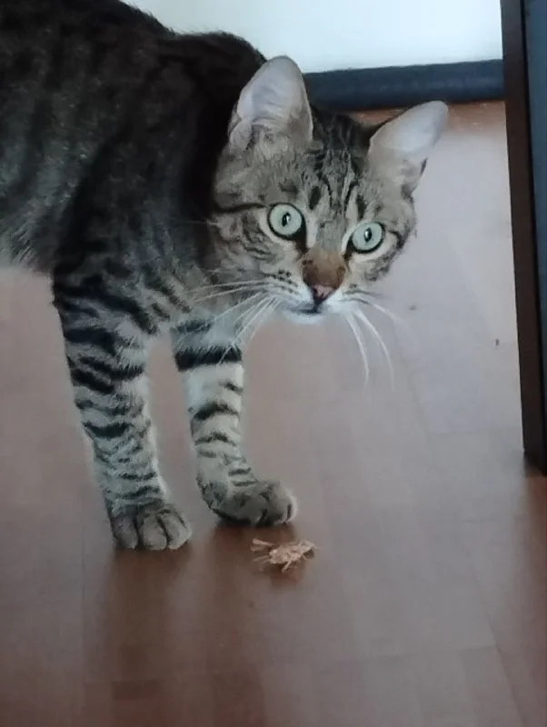 Часто зовет нашу кошку, прям смотрит на нее и воет с мурлыканьем. Она бы рада поиграть, но она тоже спать хочет и стесняется пока