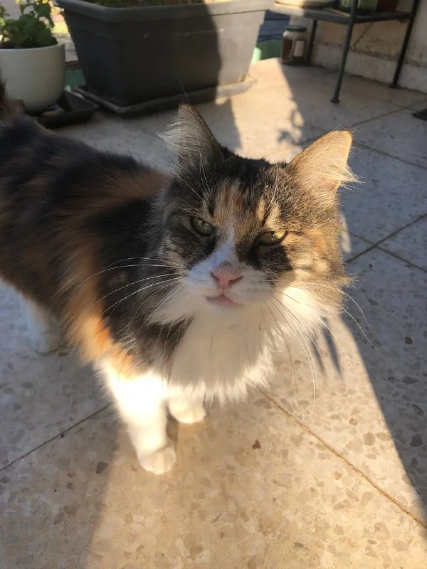 Красотка трехцветная, с зелеными глазами . Очень ласковая. Зовем Кляксой)