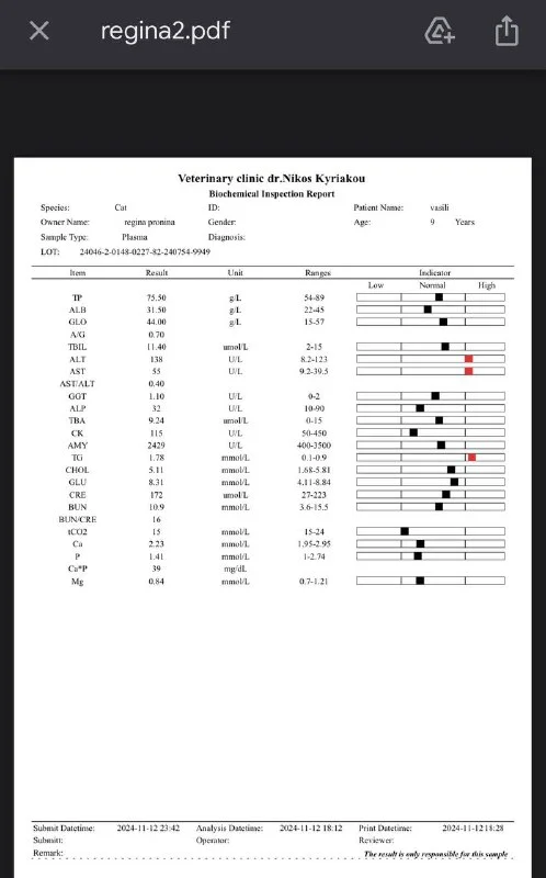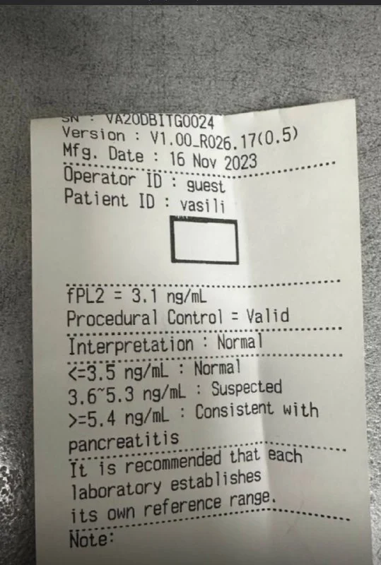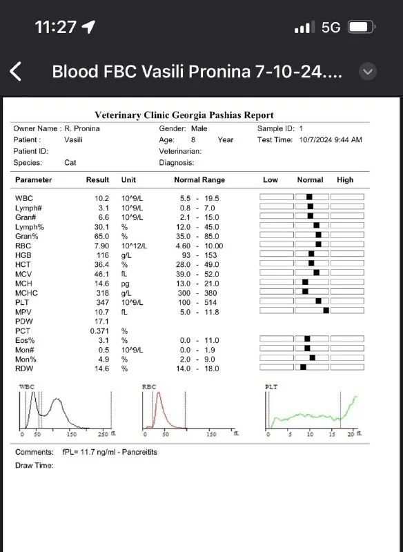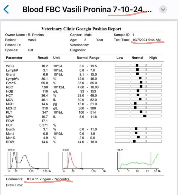 Смотрим последнюю строчку первого анализа. Потом я у вас спросил, что за третий тест на котором 2023 год, вы не ответили. По первому анализу от 7 октября 2024 у кота воспаление поджелудочной