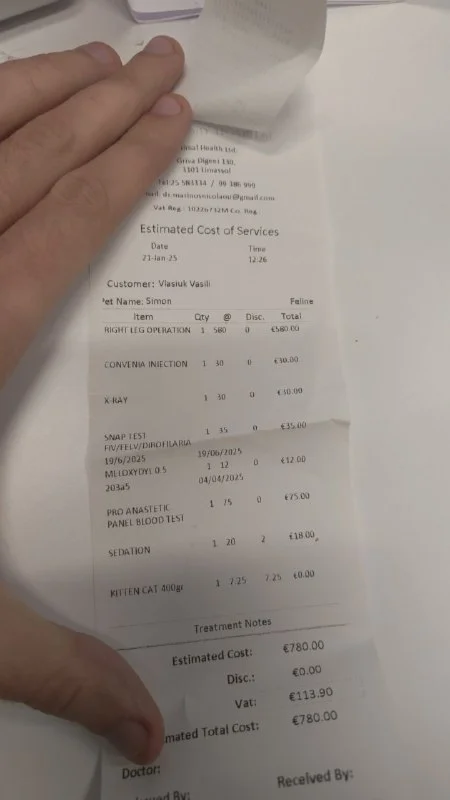 Мы расклеили объявления в том районе, где он был найден, и перед Animal health. Через день нашёлся хозяин, и он был не в восторге от вида счёта. Хозяин - киприот, утверждает, что ему друзья семьи лечат животных бесплатно итд. Я уговорил его подумать о частичной оплате, но я бы не рассчитывал.