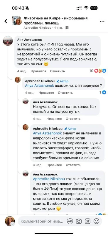 За этой кисой присматривает девушка, не уверена что она есть в этом чате, на фб точно есть. Кошечка после неврологического фипа, прошла полностью курс лечения, было хуже.