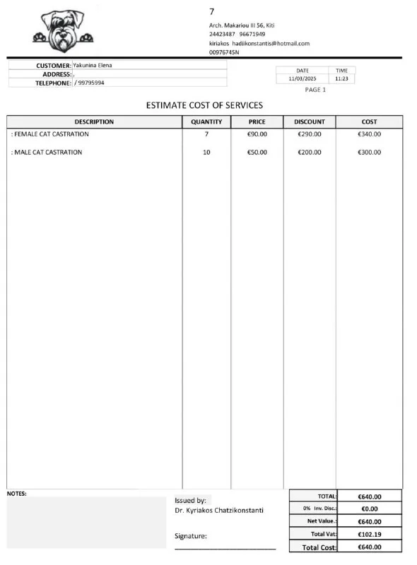 Добрый день. Посоветуйте ветеринара в Ларнаке. Обычного, не экстренного. Можно русскоговорящего. Хочу понять по всем прививкам которые есть у собаки и что нам нужно делать дальше. Так как собаку взяли уже в 9 месяцев. Нам вылетать еще летом, хочу проконсультироваться по поводу всех необходимых титров
