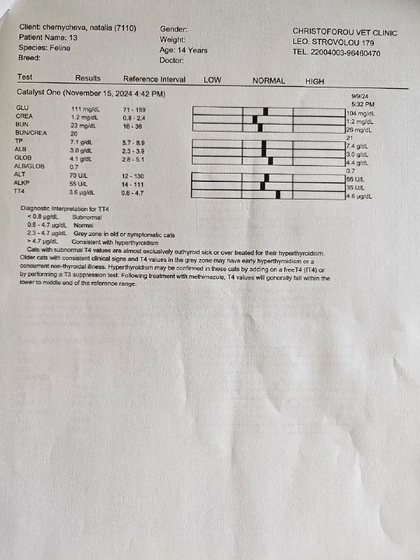 4. Сдать SDMA, общий анализ мочи + UPC, ионизированный Ca, пересдать T4