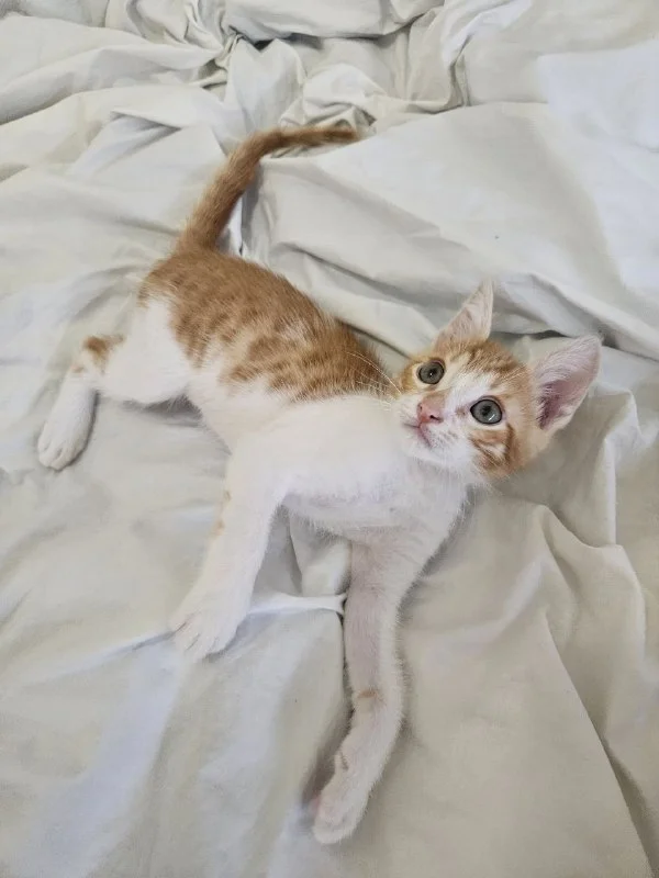 Корж очень энергичный, носится по дому, но не оставляет за собой разрушений, любимые вещи – пара пакетиков и игрушка с колокольчиком. По ночам не мяучит и не рвется к нам в спальню. Любит людей, но не ужился с нашим взрослым котом, поэтому ищем дом без других животных.