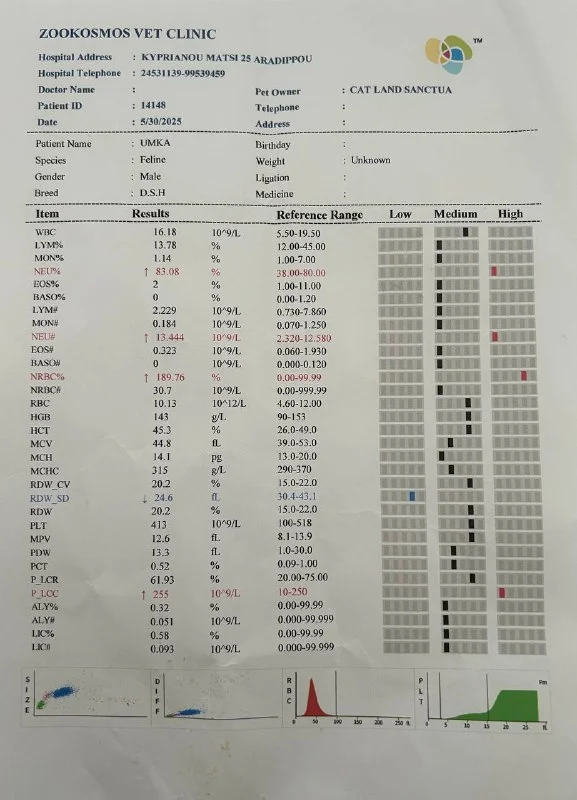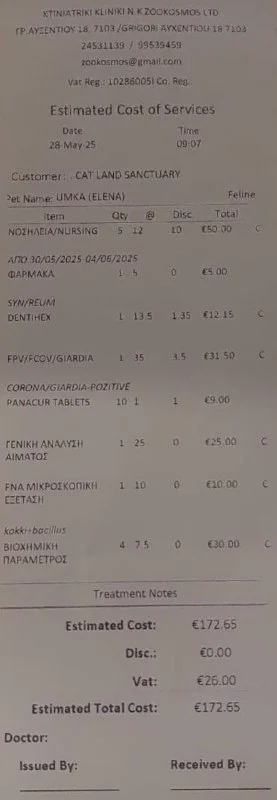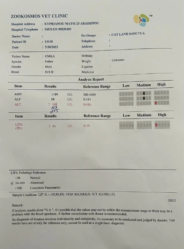 29.05 вдруг стало хуже (рвота, журчал животом), 30.05 - отказ от еды, помчались в Ларнаку в Зоокосмос. По тестам корона и джардии, панкреатит, лимфоузлы увеличены в зоне ЖКТ, температура 40.4, во рту воспаление десен, которого не было (зубы не здоровые, но дёсны не были ранее воспалёнными). Подозрение на аллергию…