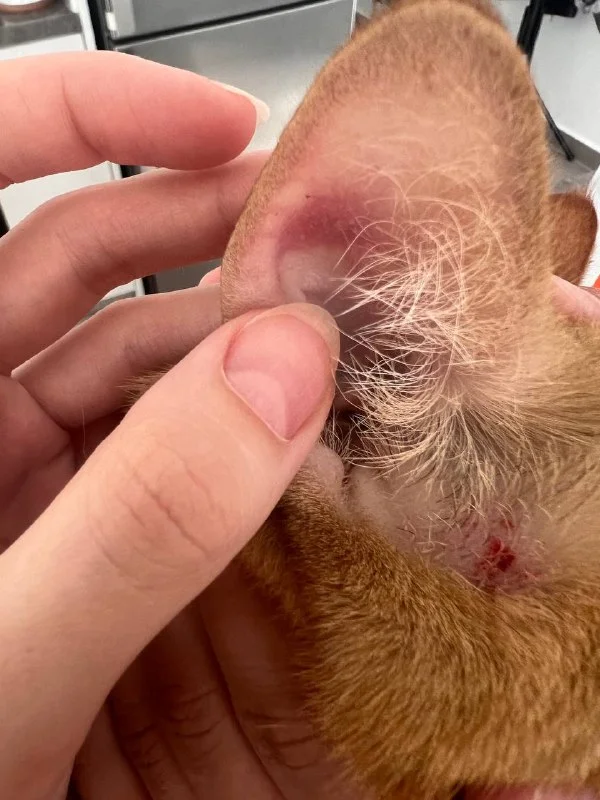 Всем привет! Помогите советом. Кот расчесывает уши до крови, за ухом тоже рана. Сегодня ещё в ухо появилось пятно бурое. Это похоже на лишай?
