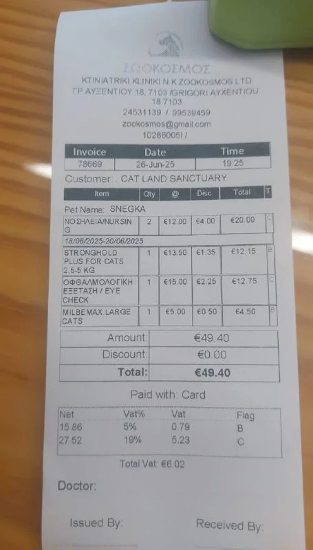 У Феликса в чеке стоит 140 - 10 евро Дискаунт от Людмилы - потому, что она принесла нам наличные в клинику ♥️ и чек получился вот таким😊