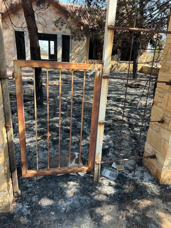 Марина собака выбежала, когда он открывал дверь гаража, чтобы эвакуироваться перед наступлением огня. Дома она точно не осталась.