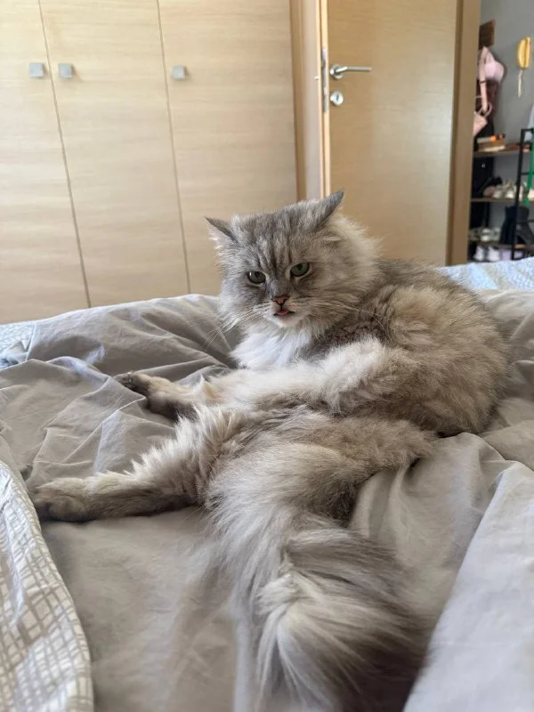 Прям ждёт на стульчике лежит когда я выйду "из кабинки" и буквально лезет на руки, урчит и перебирает лапками от нетерпения.