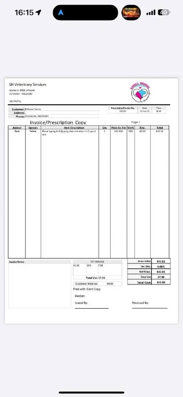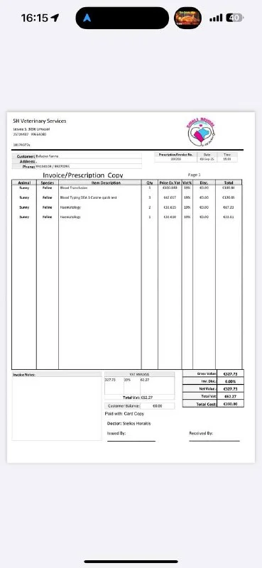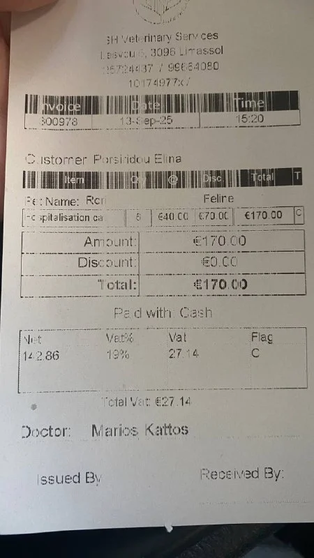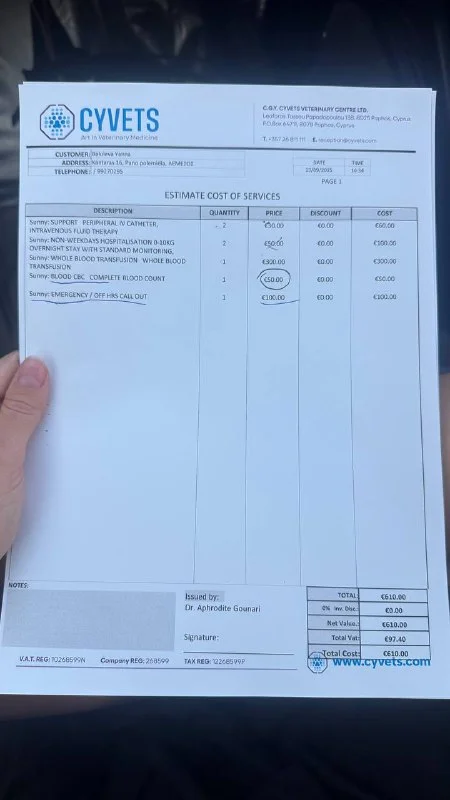 Сегодня Саничка направляется на переливание крови в CyVets, так как её состояние требует срочной поддержки. Ранее ей уже пришлось сделать экстренное переливание в Small Animal Clinic — инвойсы прилагаем.