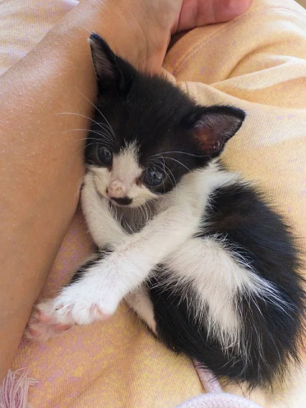 Найденыш из Гермасойи, которая отбилась от мамы и в 3 недели оказалась в компании котят-подростков без кормящей мамы.