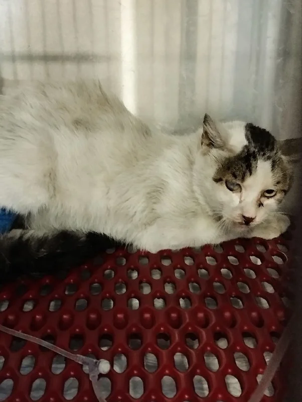 Котик с сегодняшнего дня в клинике. К сожалению, мы не нашли помощь с транспортом и Вилене пришлось ехать на огромное расстояние, чтобы забрать бедного ребенка за что ей отдельное огромное спасибо. Котика мы поймали, у него даже нашлись силы встать на лапки, но убежать не смог. Анализы крови нехорошие. Подозрение на ФИП, панкреатит, почки, плохие зубы на удаление, не ест. Были же сразу поставлены капельницы, котик очень тощий и сильно обезвожен.