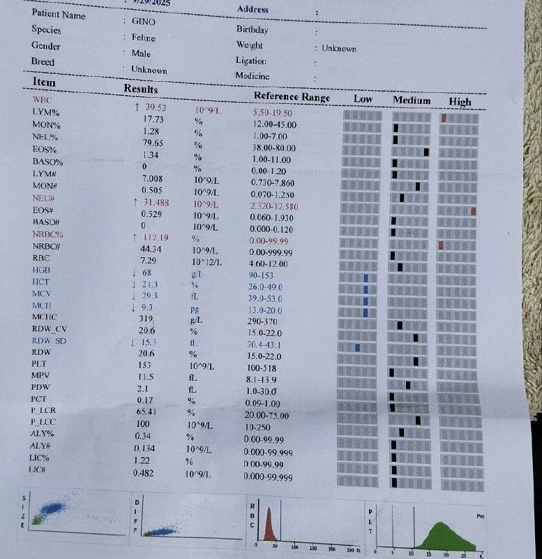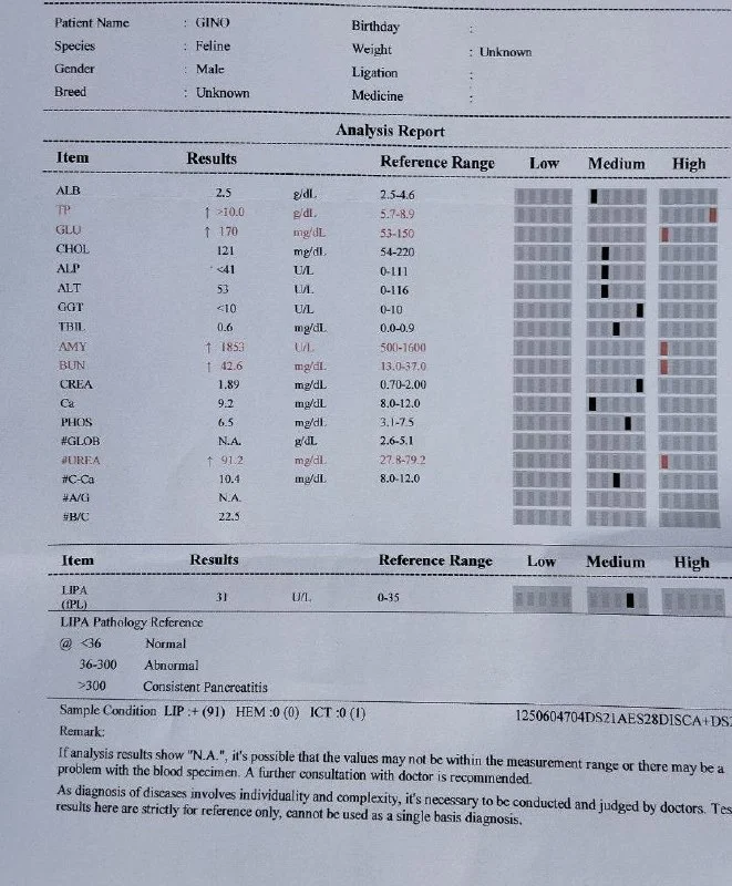 На данный момент для Джино собрано 102€, сможем оплатить один анализ крови и Снап тест на Fiv/felv, чеки будут приложены 🙏