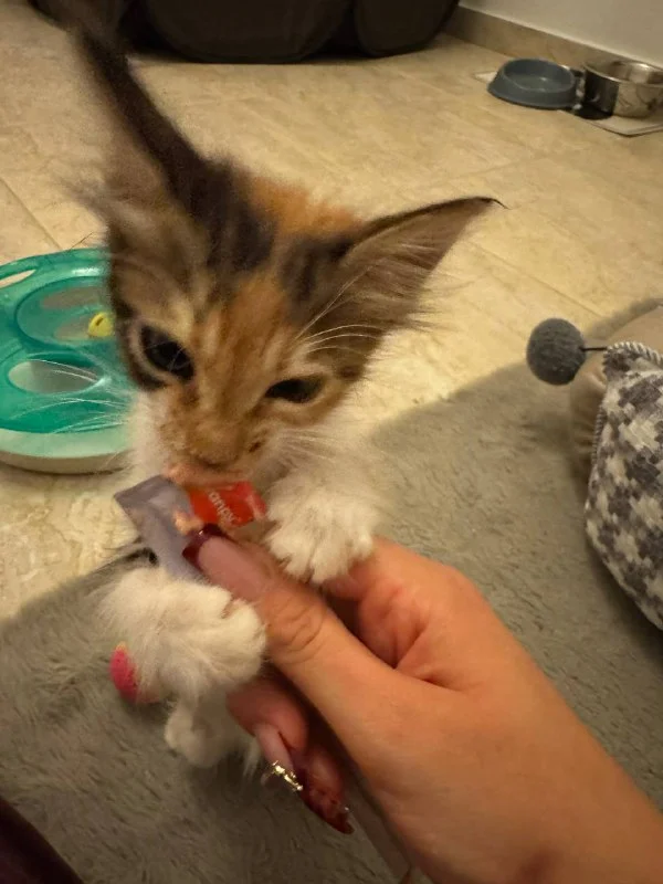 Я его отвезу сейчас в ветклинику, если кто-то может забрать после себе котенка, я буду очень благодарна, мне дома нельзя иметь кота. Ему где-то месяц, полтора есть, красивый